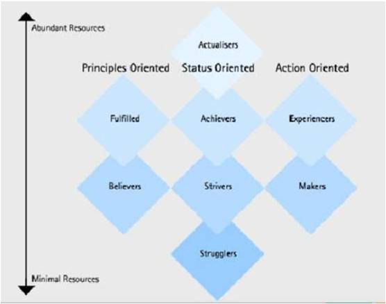成就者(10%的美國人口)也是以地位為導(dǎo)向。他們具有多的資源。他們關(guān)心他們的工作和家庭,并努力在工作傷有所成功。他們在政治上較為保守,尊重執(zhí)政當(dāng)局。這種理念不會變化。